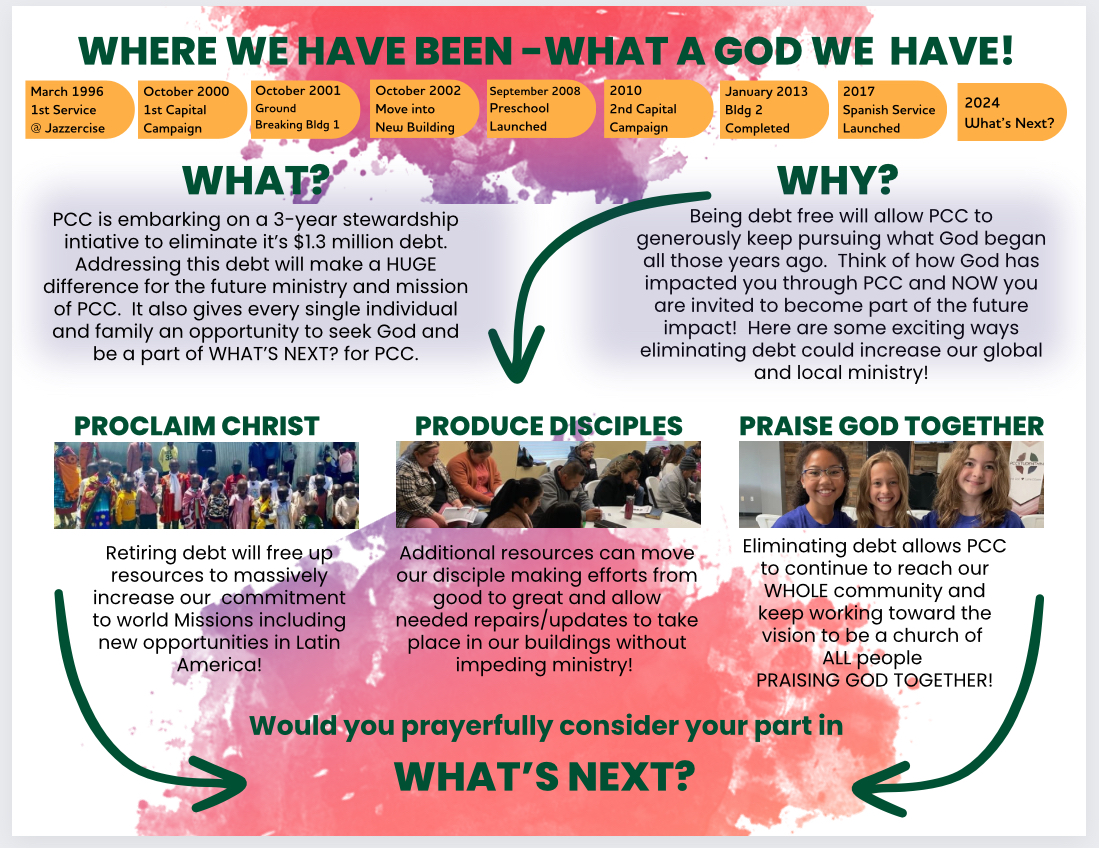 This is an exciting time for our church and community! We are so thankful for your prayerful consideration! If you have any questions about the WHAT’S NEXT INITIATIVE, please contact